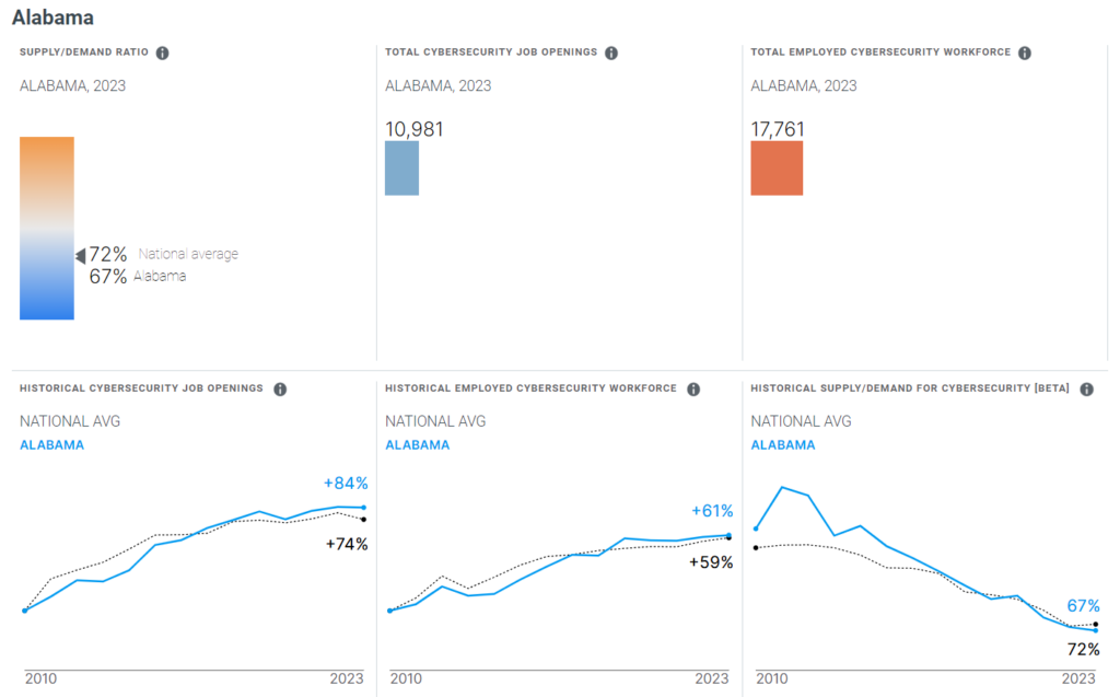 There are also 10,981 new cybersecurity job openings published by Alabama employers. The job market is tight, with restricted supply and rapidly growing demand, which augurs well for the future of Alabama cybersecurity professionals.