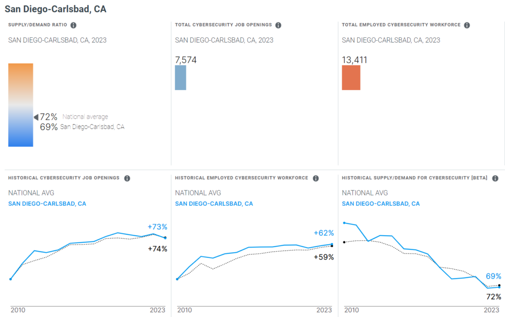 According to CyberSeek data, there are about 13,411 people employed in the cybersecurity workforce in the San Diego-Carlsbad region, with 7,574 cybersecurity job openings still waiting to be filled.