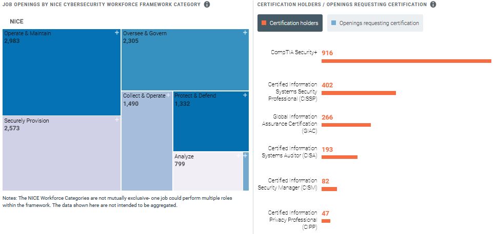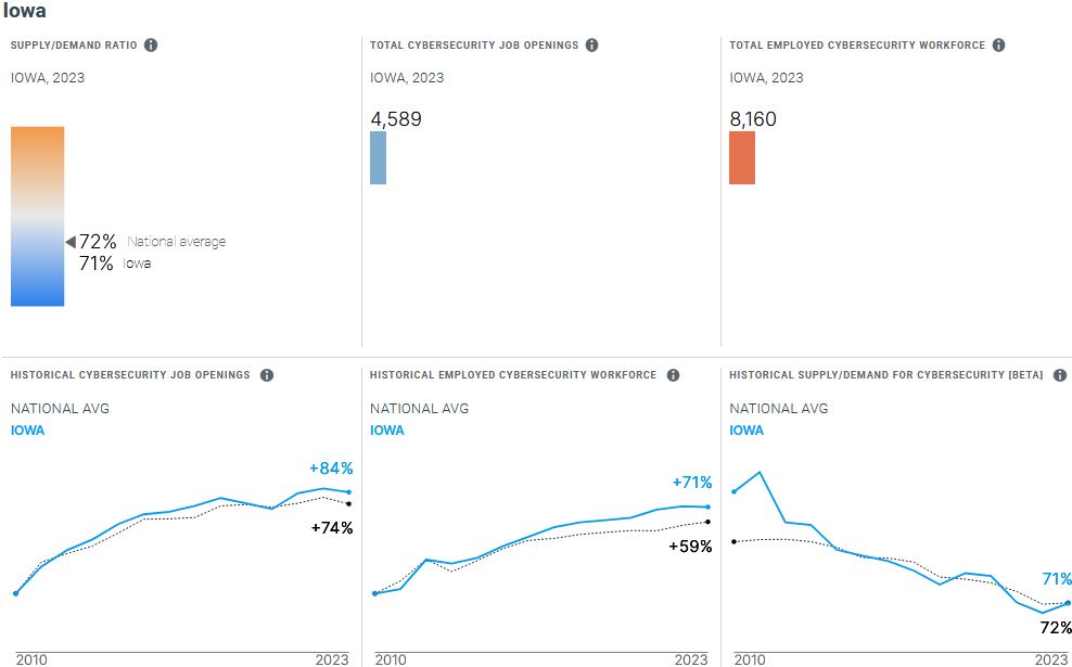 According to CyberSeek, there are about 4,589 total cybersecurity job openings and 8,160 currently employed cybersecurity workers and Iowa’s capital Des Moines is the best place to look for cybersecurity employment since there are 2,301 total job openings currently.