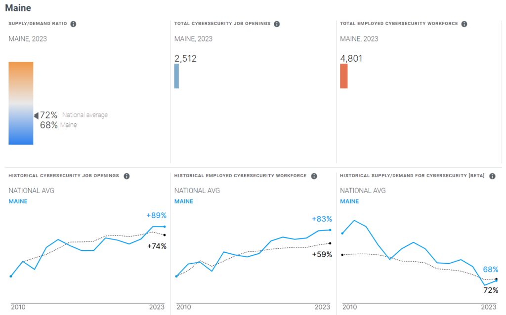 CyberSeek states that there are a total of 4,801 currently employed in Maine with 2,512 job openings for cybersecurity-related positions.