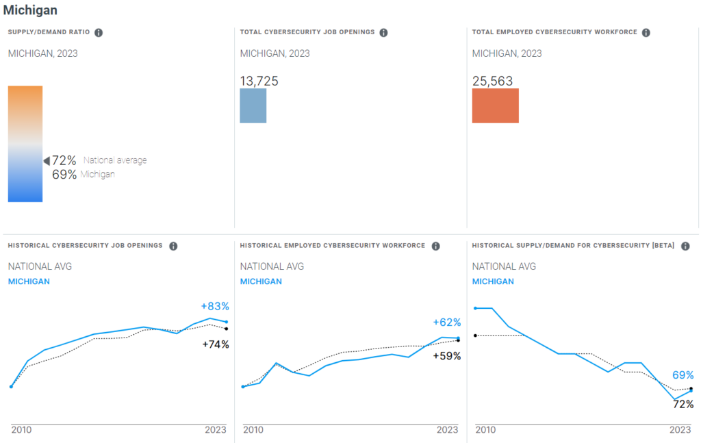 This even includes their currently employed cybersecurity workforce of 25,563, indicating that the automotive and high-tech industries in Michigan are still looking to grow their workforces despite their current concentration.