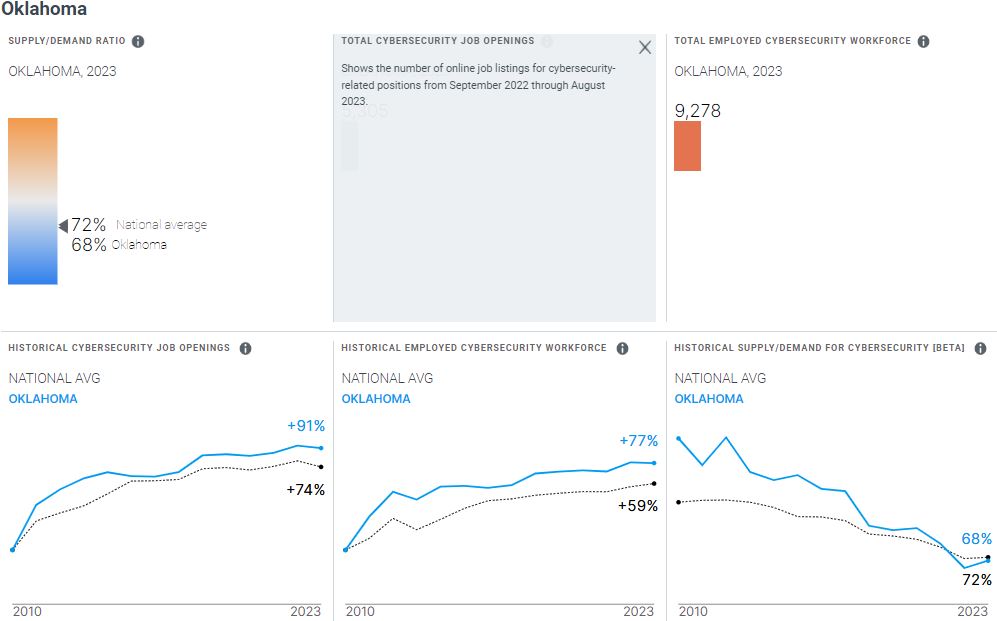 Oklahoma currently is among the country’s smaller markets for cybersecurity professionals. Cyberseek reported that from September 2022 through August 2023, 9,278 cybersecurity professionals were employed in Oklahoma.