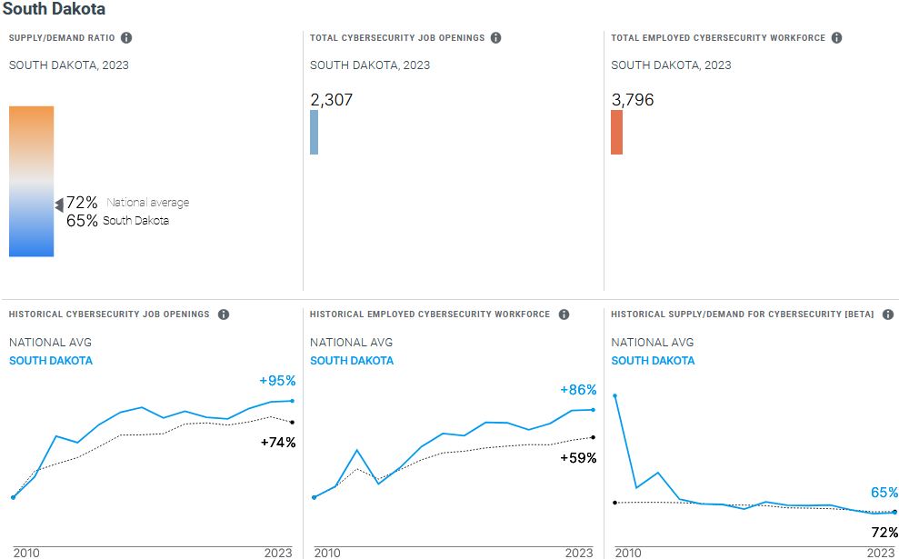 CyberSeek, a cybersecurity jobs data aggregator, suggests that there are currently 2,307 cybersecurity positions open in South Dakota. A majority of the available 529 jobs are located in the Sioux Falls region. Not coincidentally, this is also where many of the aforementioned banks are headquartered.