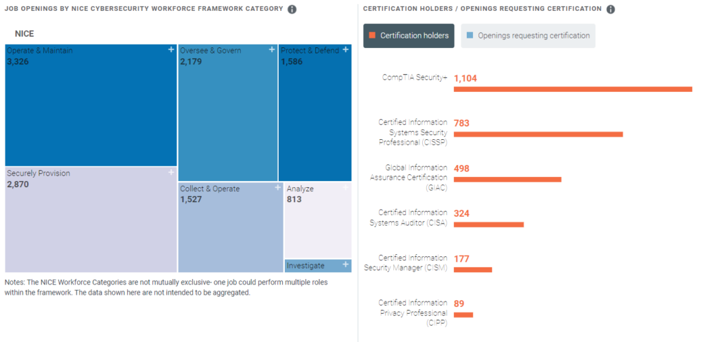 According to 2023 CyberSeek data, 11,581 people are currently employed in cybersecurity-field and there are 5,304 job opportunities.