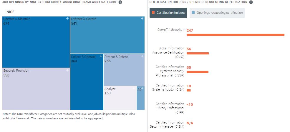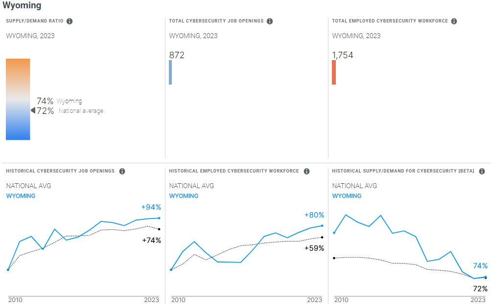 Cyberseek’s data shows a total of 872 job openings in Wyoming, and about 1,754 people maintain employment in the cybersecurity sector from September 2022 through August 2023.